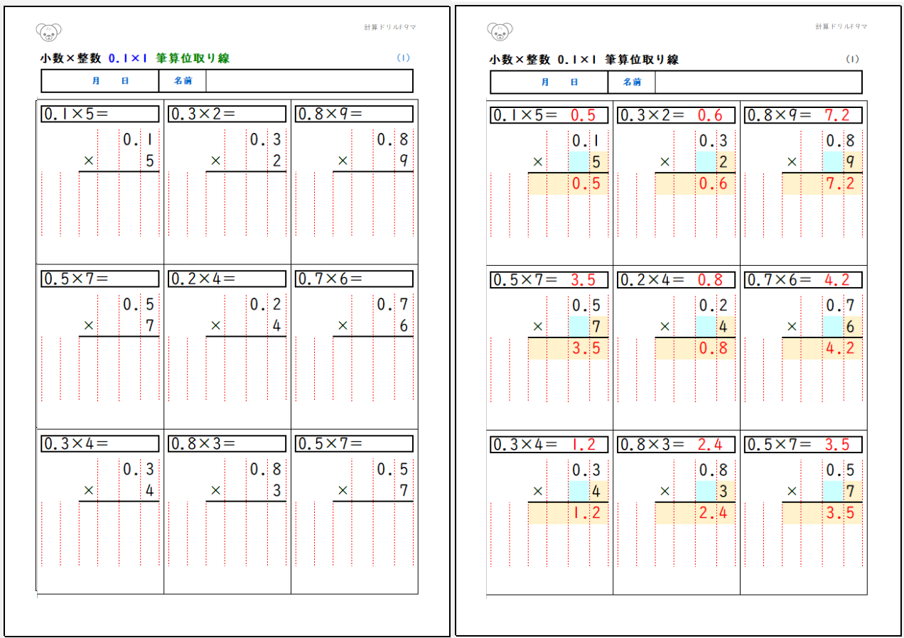| ①0.1×1 0.2×3 0.4×5 0.7×8 など ※教科書では暗算で計算します。 計算が苦手な子どものために、筆算の導入として作りました。 必要のない子どもにはスキップしてください。 |