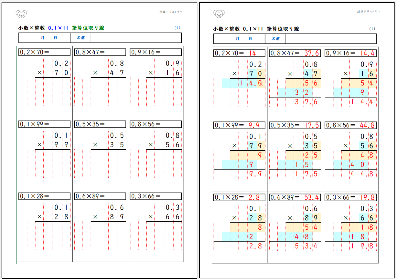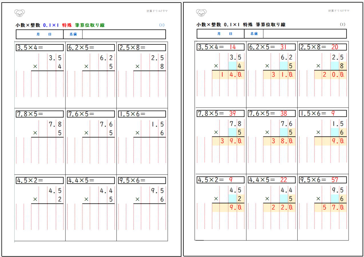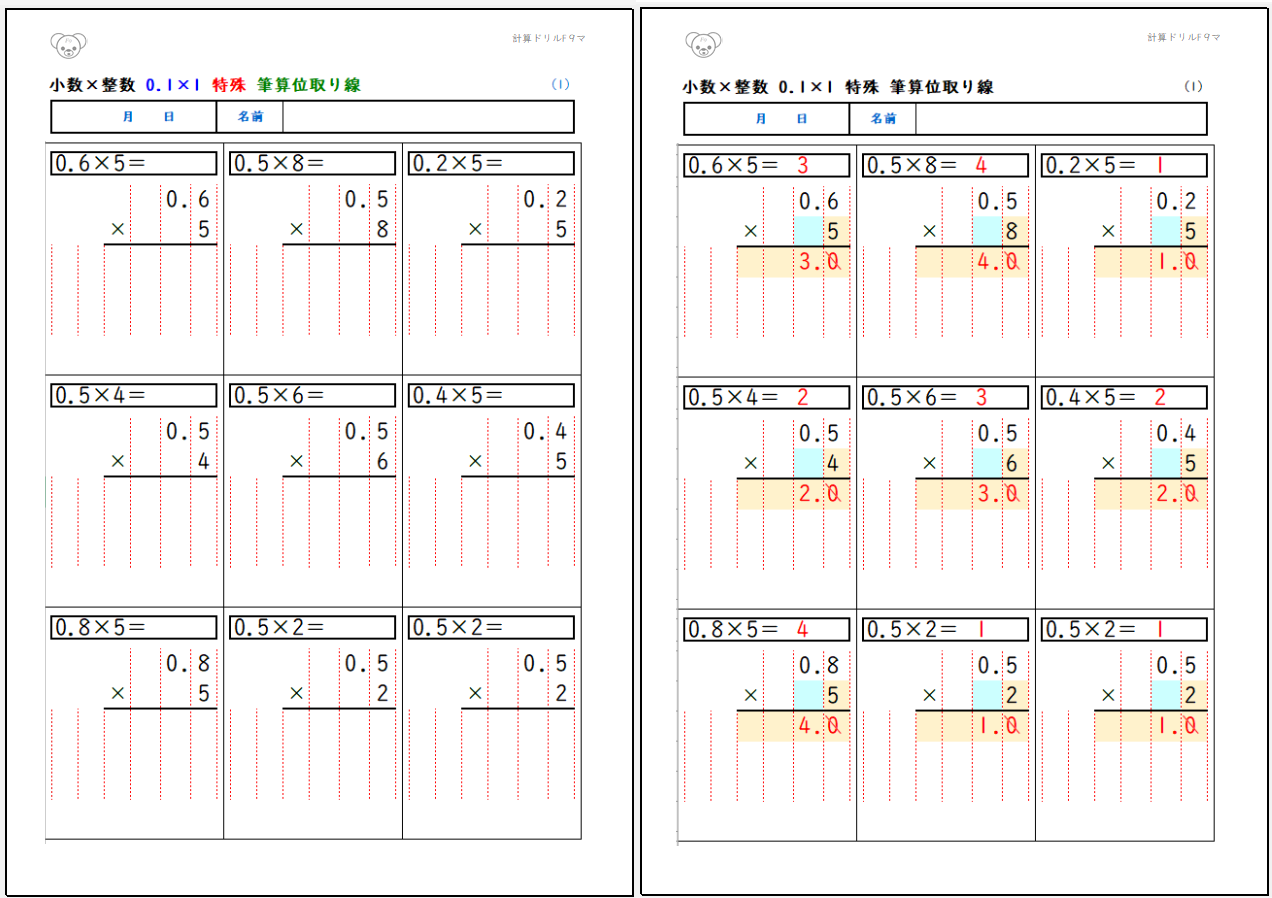 | ②0.1×1 特殊 0.2×5 0.6×5 0.5×4 など 積の小数第一位の数字が0になる問題だけを出題します。 積の小数部分の末尾が0になるときは斜線で消す約束に慣れるためのドリルです。 必要のない子どもにはスキップしてください。 |