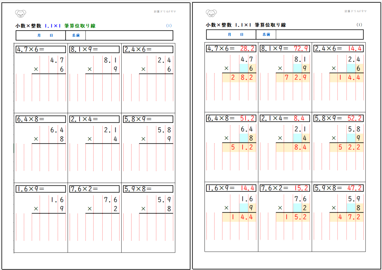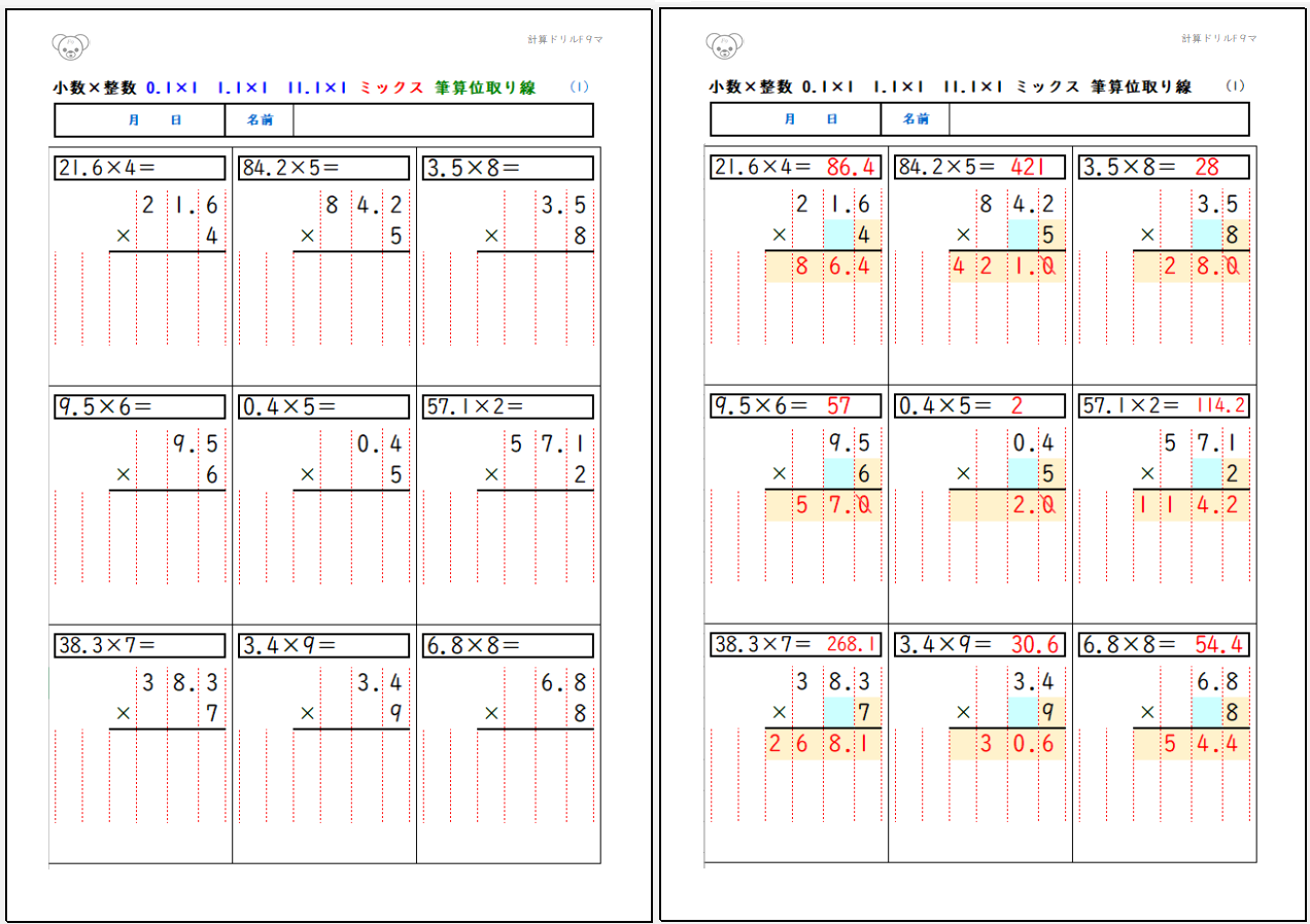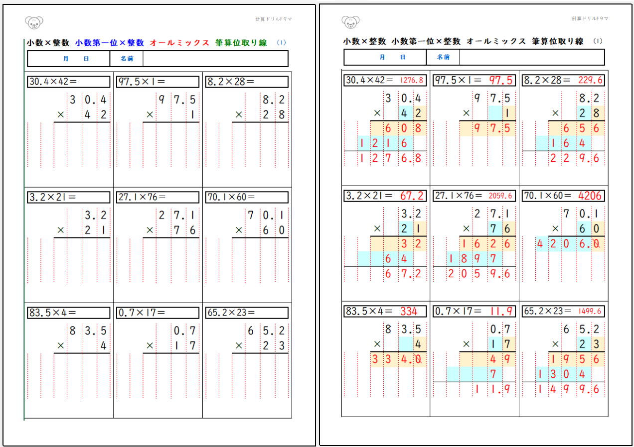 式・小数第一位×整数 筆算 位取り線 B のドリルです。