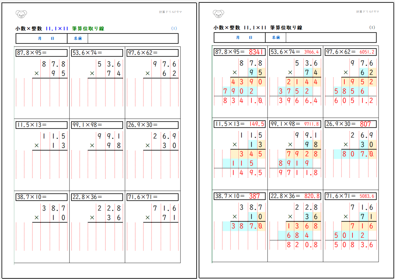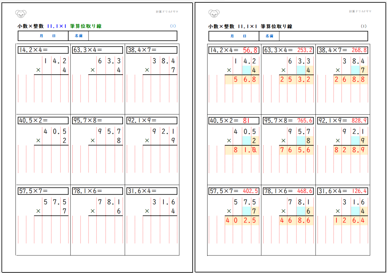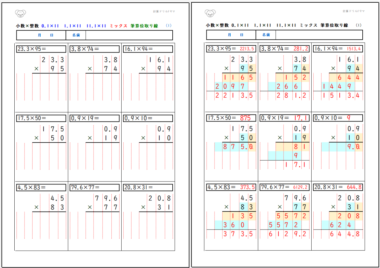 | ⑪オールミックス ①から⑩までのドリルの問題をランダムに出題します。 0.3×2 0.7×53 8.4×3 2.3×47 5.14×2 61.3×78 23.8×35 など 問題がかたよることがあります。 印刷する前に確認してください。 |