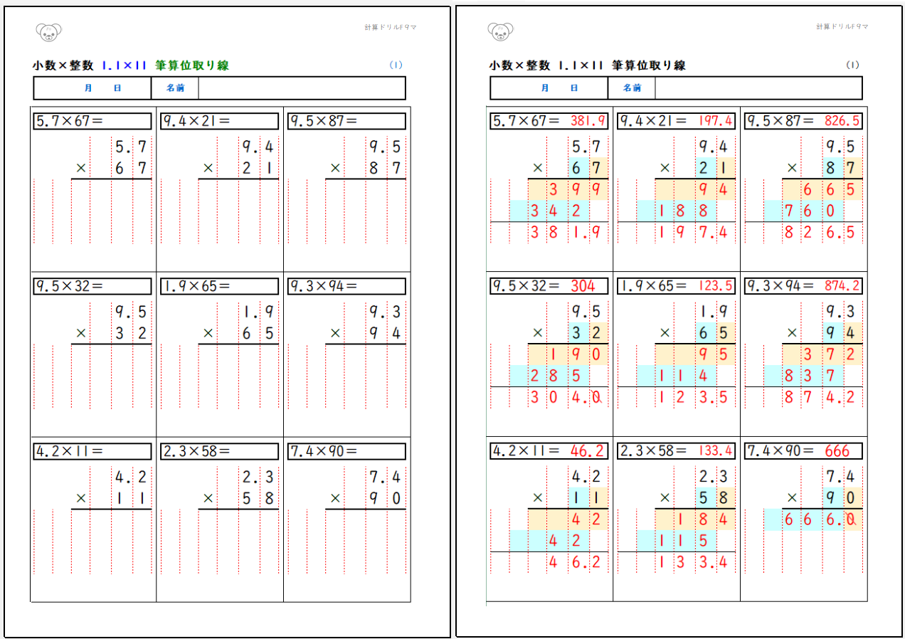 | ④1.1×1 特殊 2.4×5 4.8×5 7.5×4 など 積の小数第一位の数字が0になる問題だけを出題します。 積の小数部分の末尾が0になるときは斜線で消す約束に慣れるためのドリルです。 必要のない子どもにはスキップしてください。 |
