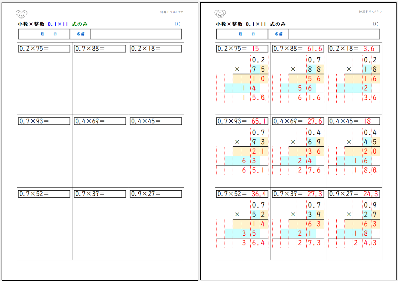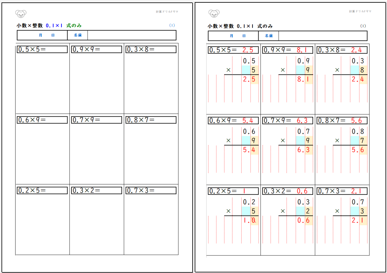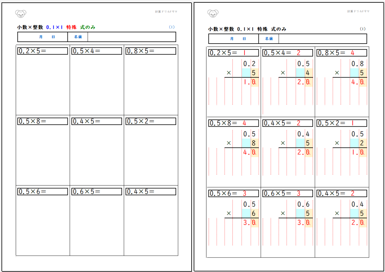 | ②0.1×1 特殊 0.2×5 0.6×5 0.5×4 など 積の小数第一位の数字が0になる問題だけを出題します。 積の小数部分の末尾が0になるときは斜線で消す約束に慣れるためのドリルです。 必要のない子どもにはスキップしてください。 |