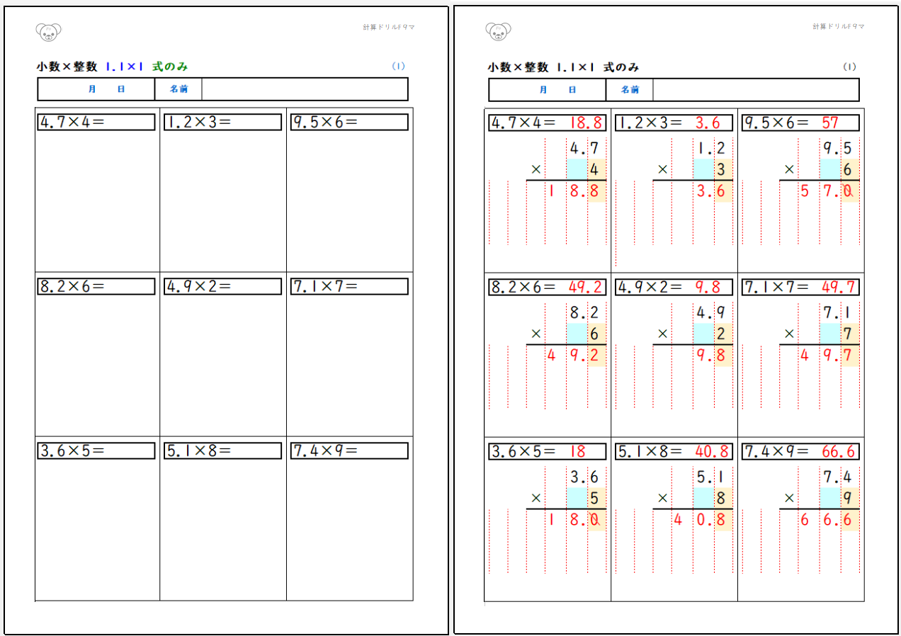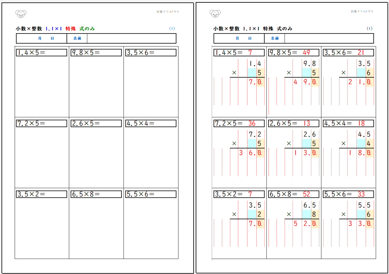 | ④1.1×1 特殊 2.4×5 4.8×5 7.5×4 など 積の小数第一位の数字が0になる問題だけを出題します。 積の小数部分の末尾が0になるときは斜線で消す約束に慣れるためのドリルです。 必要のない子どもにはスキップしてください。 |