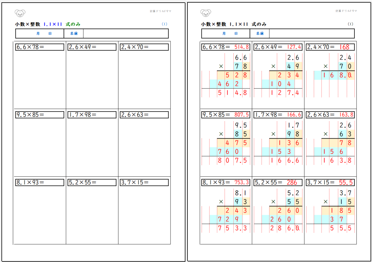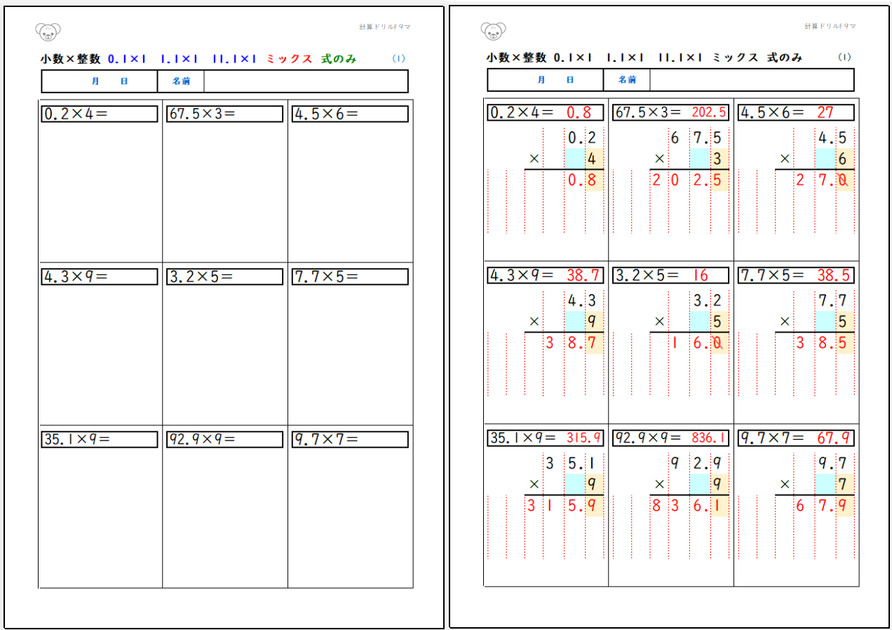 | ⑪オールミックス ①から⑩までのドリルの問題をランダムに出題します。 0.3×2 0.7×53 8.4×3 2.3×47 5.14×2 61.3×78 23.8×35 など 問題がかたよることがあります。 印刷する前に確認してください。 |