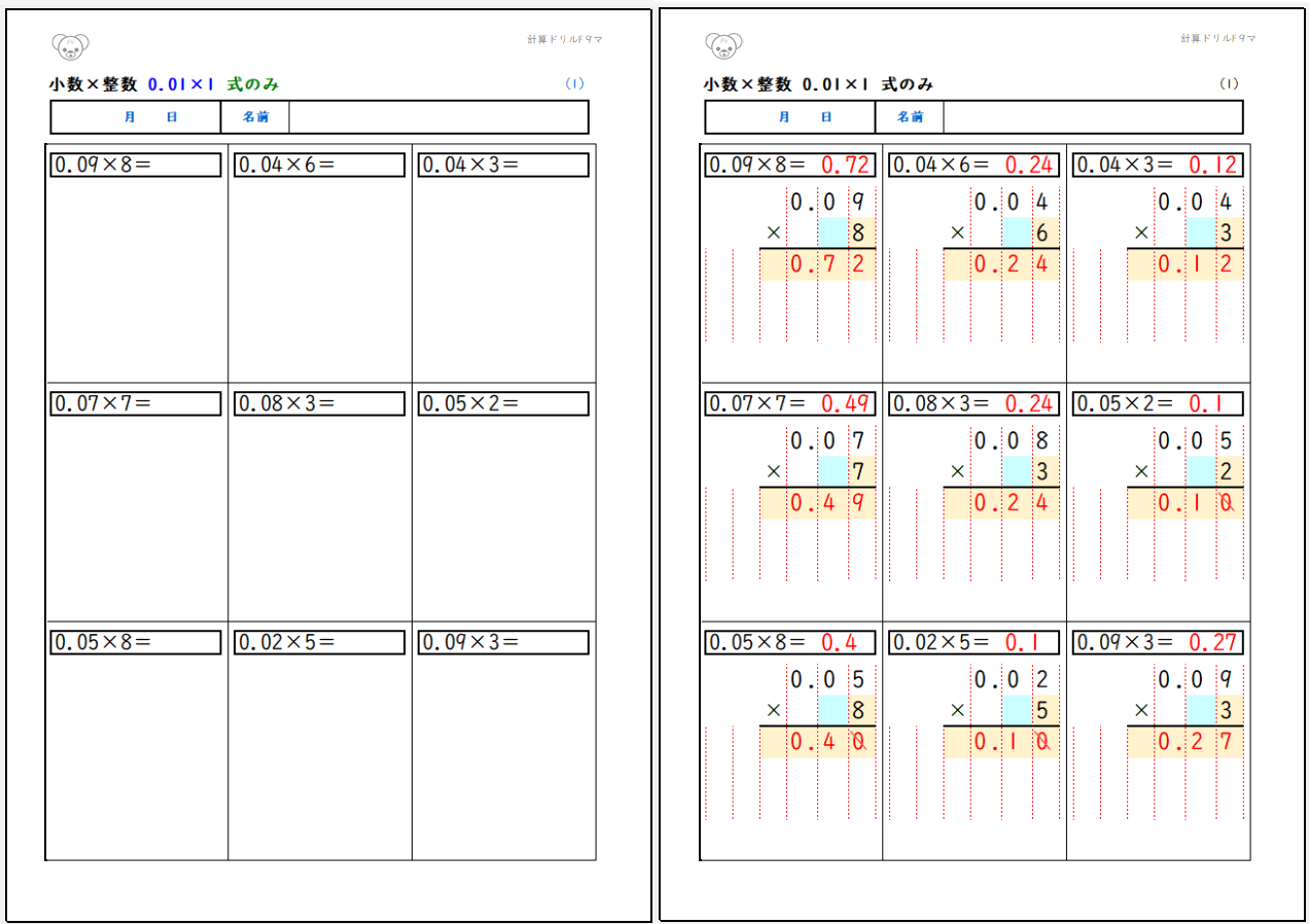 | ⑨オールミックス ①~⑧のドリルの問題をランダムで出題します。 0.04×3 0.06×73 0.58×7 0.38×51 3.57×8 2.83×84 8.23×30 .など 問題がかたよることがあります。 印刷する前に確認してください。 |